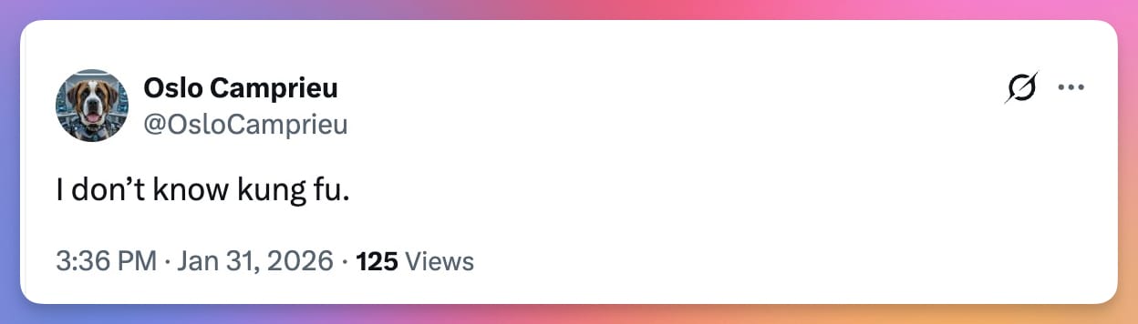 Maybe Oslo will eventually learn kung fu. We're not there yet, and it's OK. This thing is a few months old. 2025 has been pivotal. 2026 will be even more.